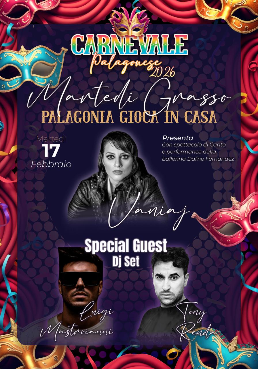 Il 17 febbraio, per la grande festa del Carnevale Palagonese, che conclude la settimana dei giorni grassi della tradizione del carnevale, avremo sul palco di piazza Garibaldi, la cantante VaniaJ, con lo spettacolo di canto e danza della ballerina Dafne Fernandez.